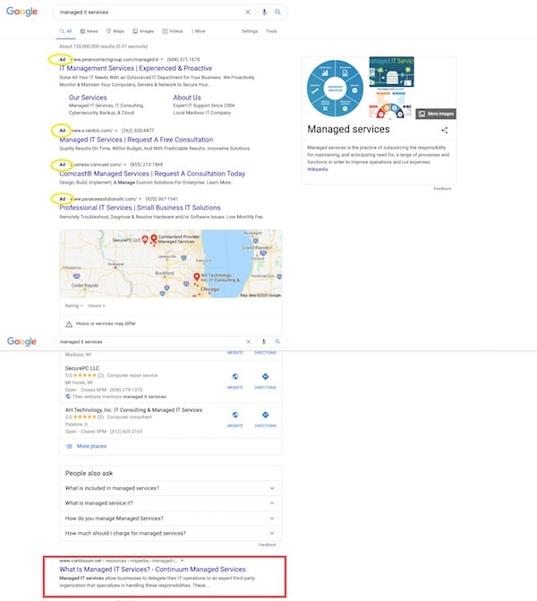 Less generic keywords, like "benefits of buying managed it services in 2023" or "it managed services vs in-house" tend to have less competition and appear on less crowded results pages than more generic keywords, like "it managed services."